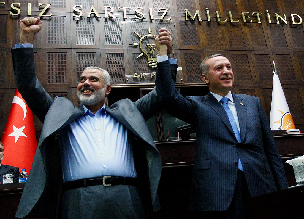 Turkish President Recep Tayyip Erdoğan comes from the ranks of militant Islamism. His love for Hamas and his dedication to the "Palestinian cause" are genuine. Pictured: Erdoğan hosts Hamas leader Ismail Haniyeh (left) at the Turkish Parliament in Ankara on January 3, 2012. (Photo by Adem Altan/AFP via Getty Images)
