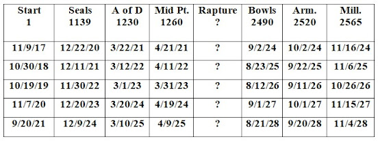 It is possible that we may be in the last 7 years now, which would be true if the last 7 years began in one of the years from 2017 to 2020. Aligning Armageddon with the feast of Trumpets in a future year yields the following.