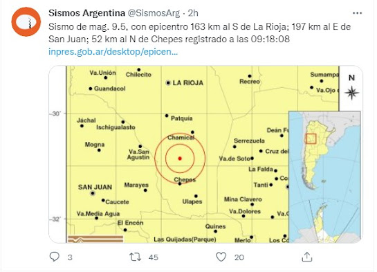 On 9/23/21 the Argentina Seismo service reported a 9.5 earthquake. This did not show up in any other sites.